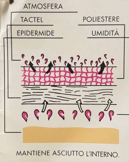Lo strato interno in TACTEL, libera la pelle dall’umidità trasportandole all’esterno per l’evaporazione lasciando asciutta la superficie corporea.
